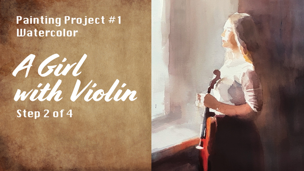 Watercolor Painting a Violin Girl in Front a Window