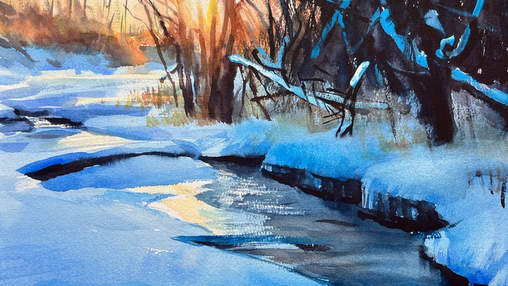 Watercolor Painting a Snowy Ground Sunset